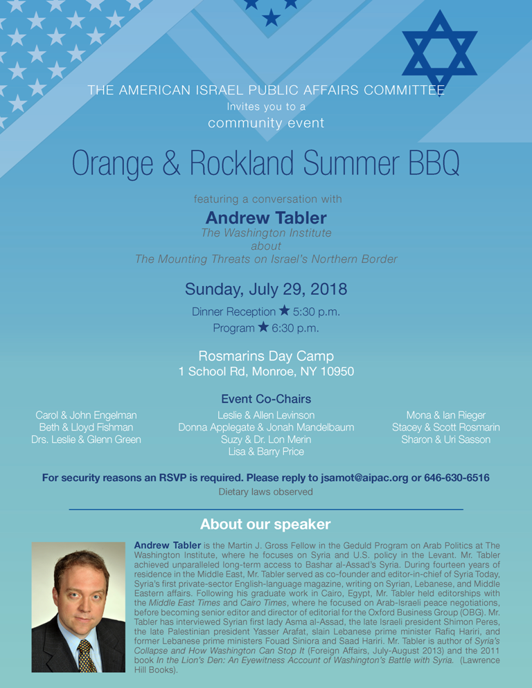 Come join the leading bi-partisan group which empowers pro-Israel activists to promote the U.S.-Israel relationship. Hear Andrew Tabler, one of the leading experts on Syria, speak about the dangers on Israel's borders. A kosher barbecue will be served at 5:30 pm.