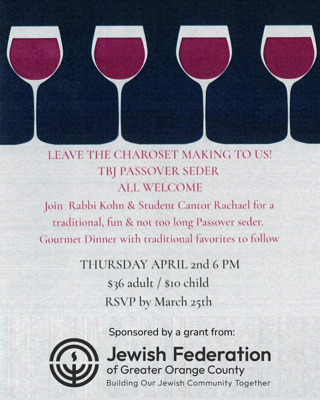 Join Rabbi Kohn & student Cantor Rachael for a traditional, fun and not too long Passover Seder.