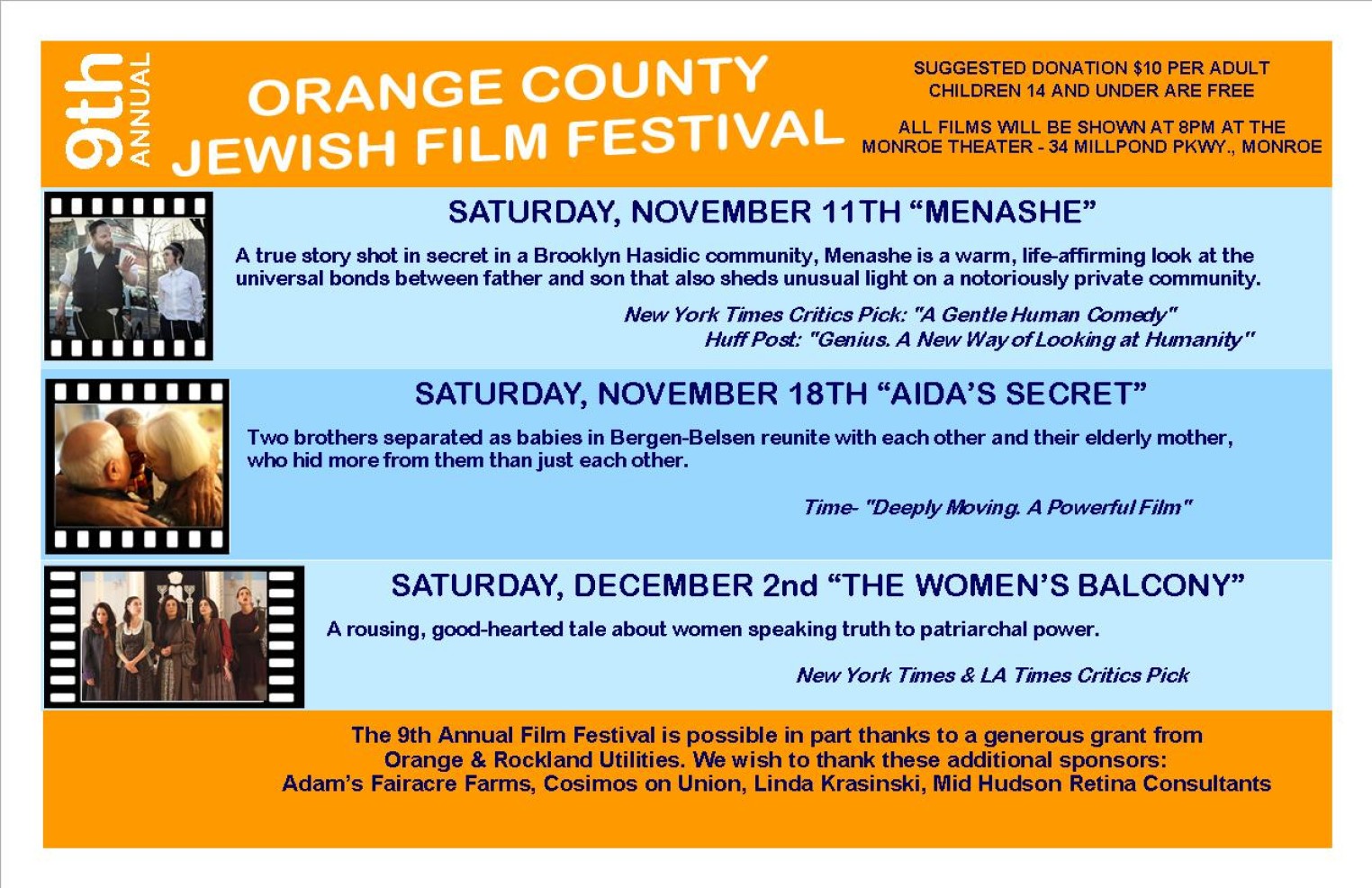 Adam's FairAcre Farms, Cosimos on Union, Eye Physicians of Orange County, Joel Finkelstein, Sharon & Jerry Goldberg, Linda Krasinski, Mid Hudson Retina Consultants, NAS Security Systems, Orange & Rockland Utilities, RI Suresky & Son Chrysler, Jeep, Hyundai
